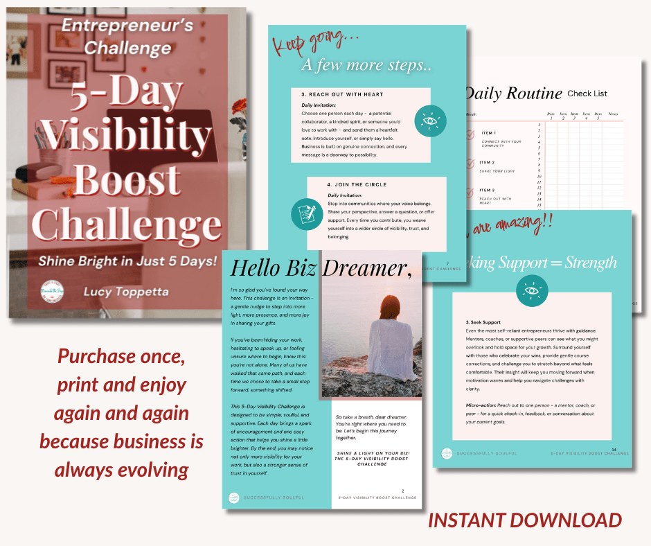 The 5-Day Visibility Boost Challenge is a heart-centered digital guide designed to help entrepreneurs shift from hesitation to confident, authentic visibility. Each day offers clear prompts, reflections, and gentle action steps to help you express your message with ease, purpose, and flow.